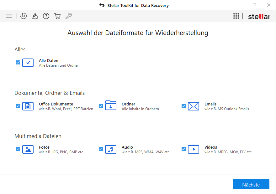 Dies ist das Kernmodul zur Wiederherstellung von Daten von Speichermedien, die auf APFS, NTFS, FAT, exFAT, HFS, HFS+, Ext2, Ext3 oder Ext4-Dateisystem basieren. Das Werkzeug Stellar Data Recovery kann die verlorenen Ordner, Dokumente, E-Mails, Fotos, Videos und Audiodateien usw. von unbegrenzten Dateiformaten scannen und wiederherstellen.