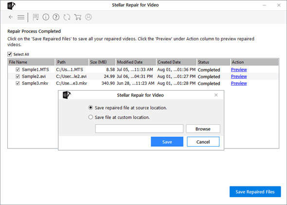 Stellar Repair for Video lets you save the repaired videos at your desired location. Your repaired movie file is saved either — at the source location or custom location, whichever you have chosen during the video repair process.