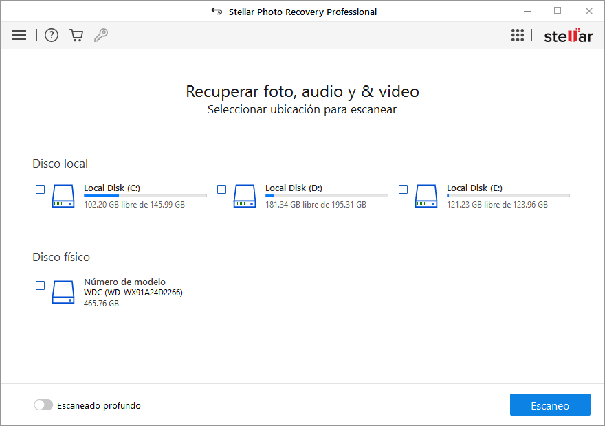 Stellar Photo Recovery Professional restaura fotos borradas o perdidas de tarjetas SD dañadas, corruptas o formateadas accidentalmente. Además, con este software de restauración de fotos a la mano, no necesitas productos diferentes para recuperar archivos de fotos y vídeo. La aplicación analiza los dispositivos de almacenamiento seleccionados y enumera todas las fotos y archivos de vídeo recuperables, que puedes previsualizar y restaurar. El software te permite la restauración de uno o varios archivos a la vez desde la tarjeta de memoria.