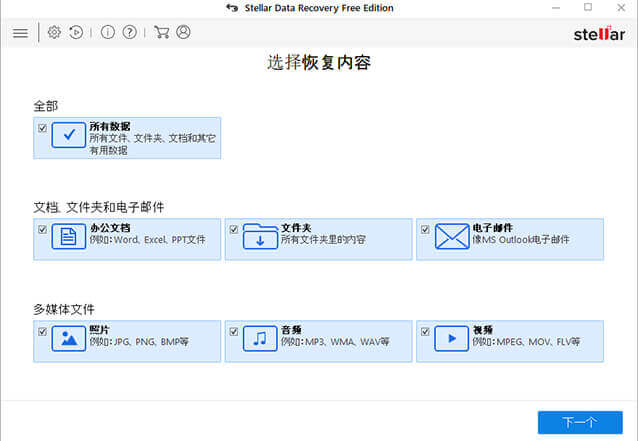 通过Stellar免费数据恢复软件主界面,选择希望恢复的文件类型,即可更快速和精准地恢复数据。