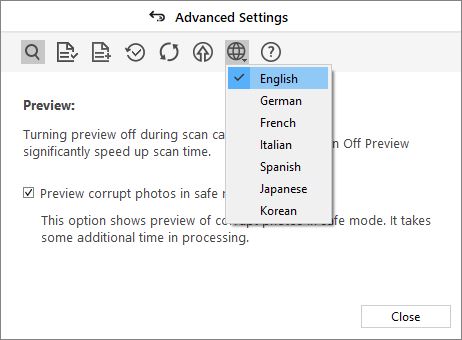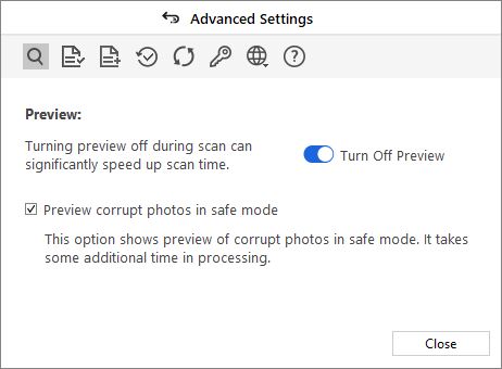 Click on the Preview icon under Advanced Settings and toggle off the Preview. There is also an option to show the Preview of only corrupt photos in Safe Mode.