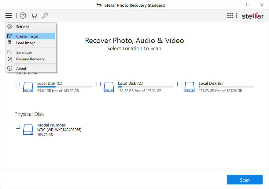 The Resume Recovery dropdown gives the option to Create Image. You can create an image of the select range of the hard drive and save it to recover files from it later. This extremely helpful in recovering photos, videos and audio files from corrupt hard drive or storage media.